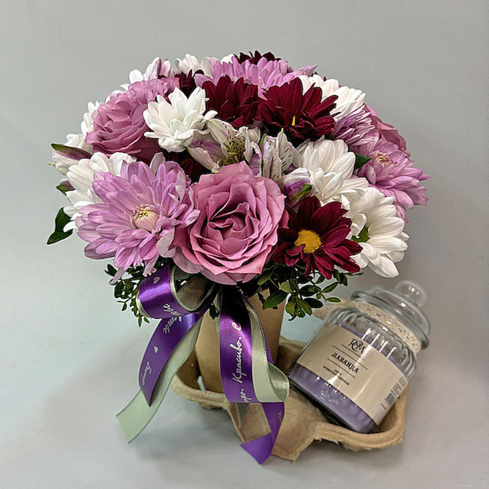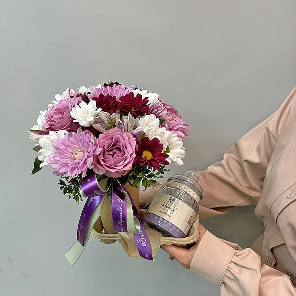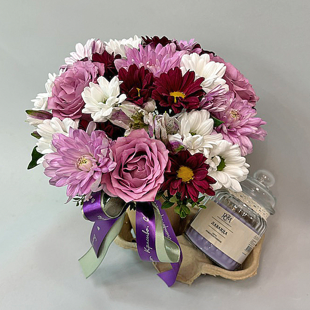 Такой сет подойдёт для поздравления с днём рождения, годовщиной или в качестве внимания близкому человеку. Компактный формат и тёплые тона делают его уместным как для домашнего интерьера, так и для рабочего стола. А сочетание цветов и свечи создаёт особое настроение, превращая момент вручения в маленький праздник.