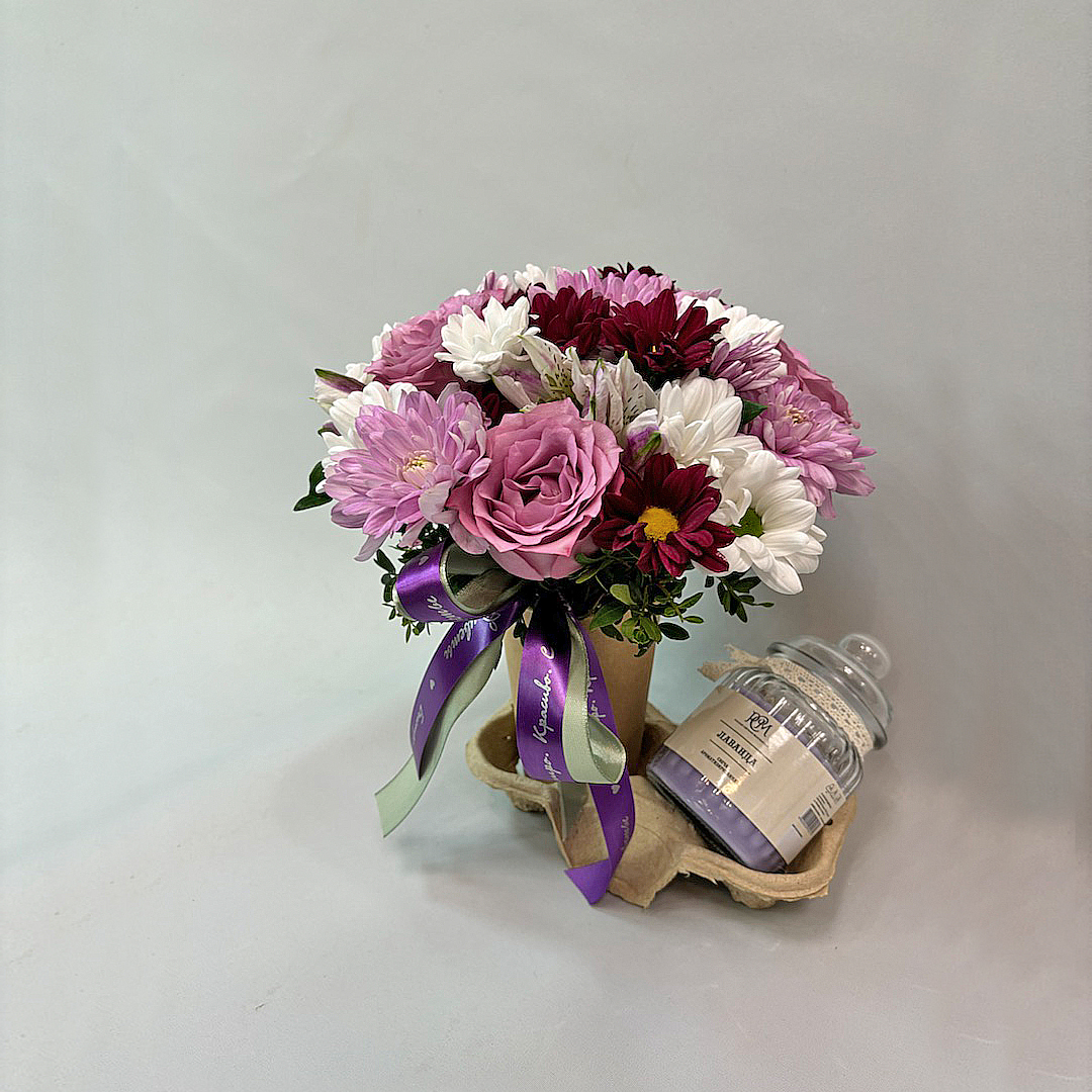 Сет "Лаванда". Набор стаканчик с цветами и аромасвечой в банке арт. 70396