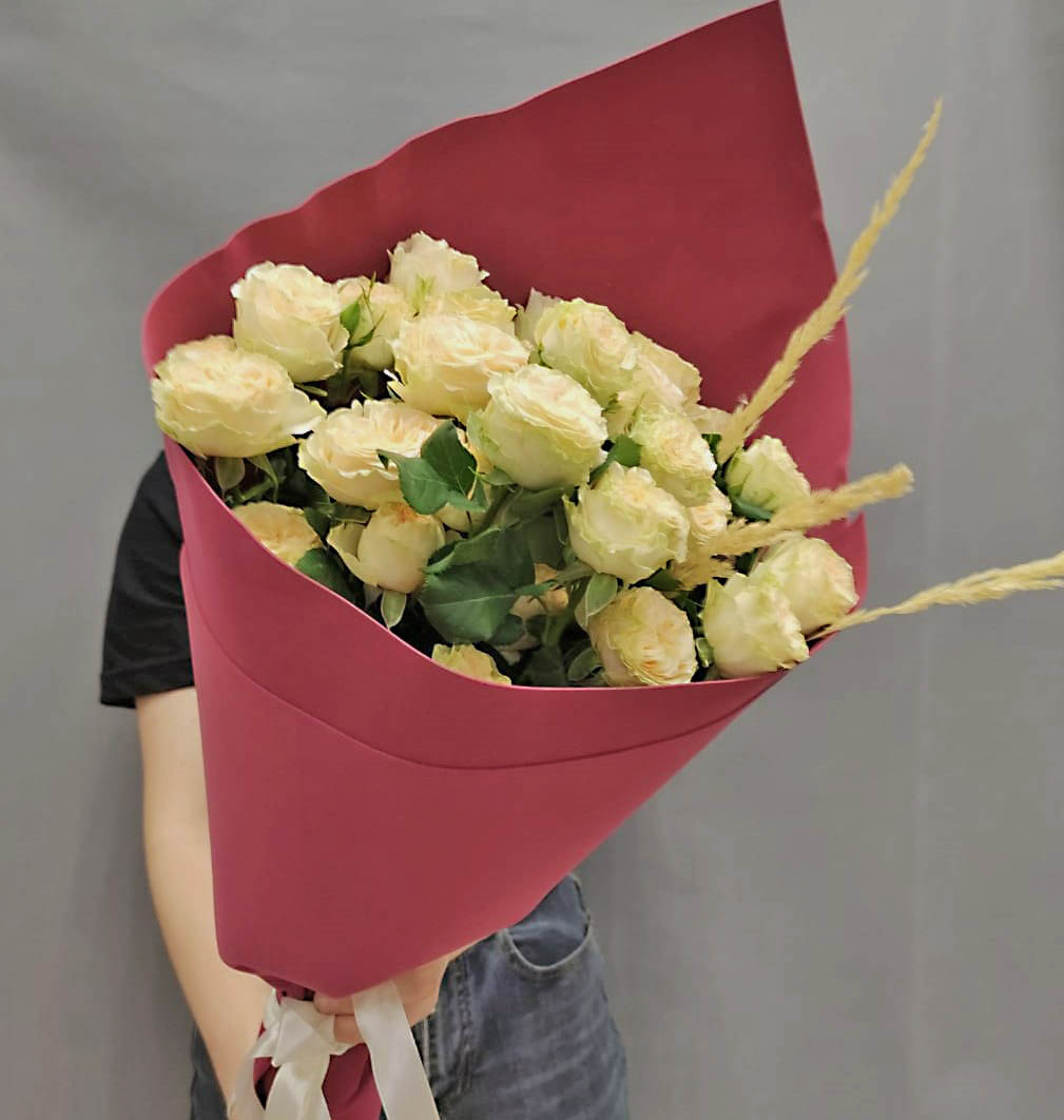 Букет из кремовых кустовых пионовидных розовых роз с эвкалиптом арт. 50416