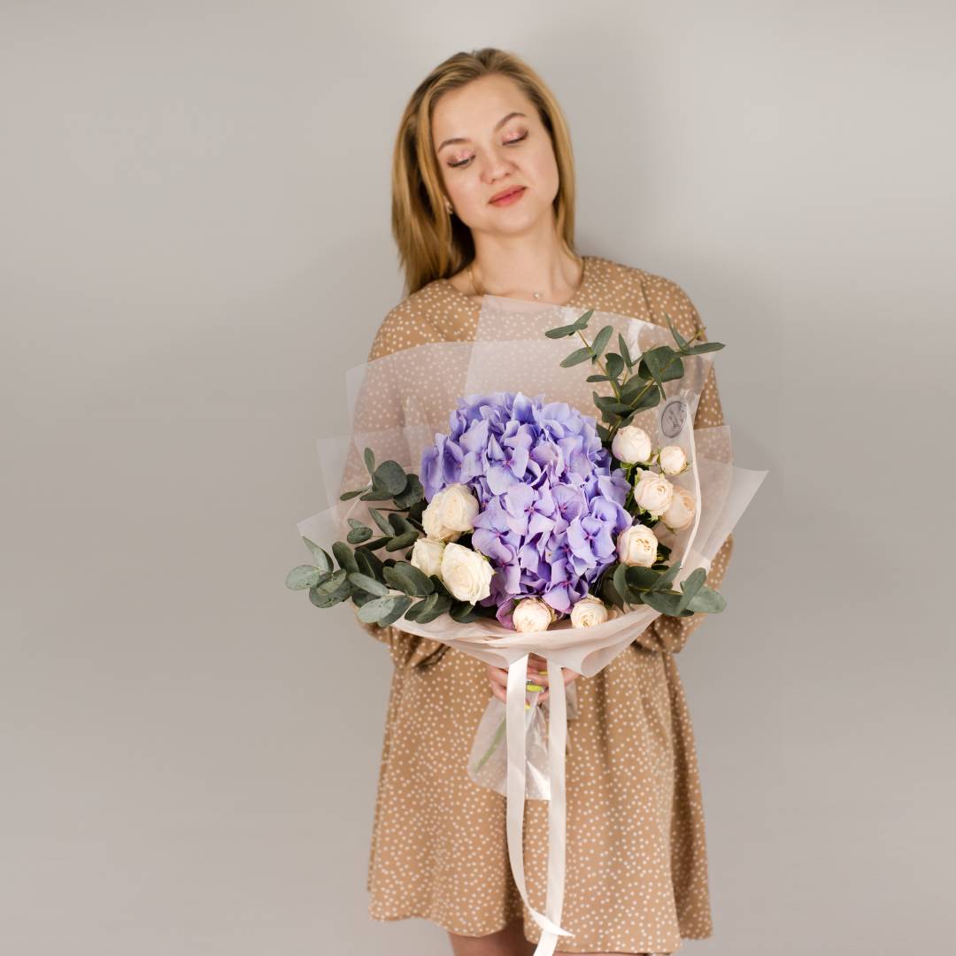 Букет из голубой гортензии с розами и мелкими ромашками арт. 66831-Г